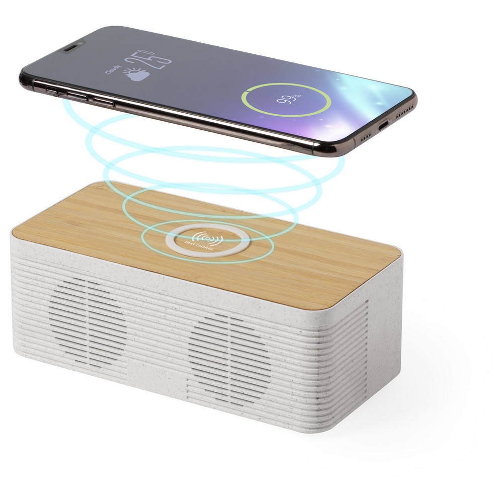 Głośnik bezprzewodowy BT 5.0 5W z włókien słomy pszenicznej, bambusowy detal, ładowarka bezprzewodowa 10W z funkcją szybkiego ładowania, działa z telefonami posiadającymi możliwość ładowania indukcyjnego, bateria 1200 mAh, posiada funkcję odbierania połączeń, wbudowany mikrofon, zasięg do 10 m, ładowany przez USB, kabel micro USB w komplecie