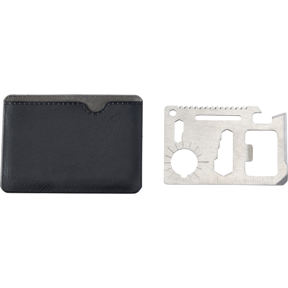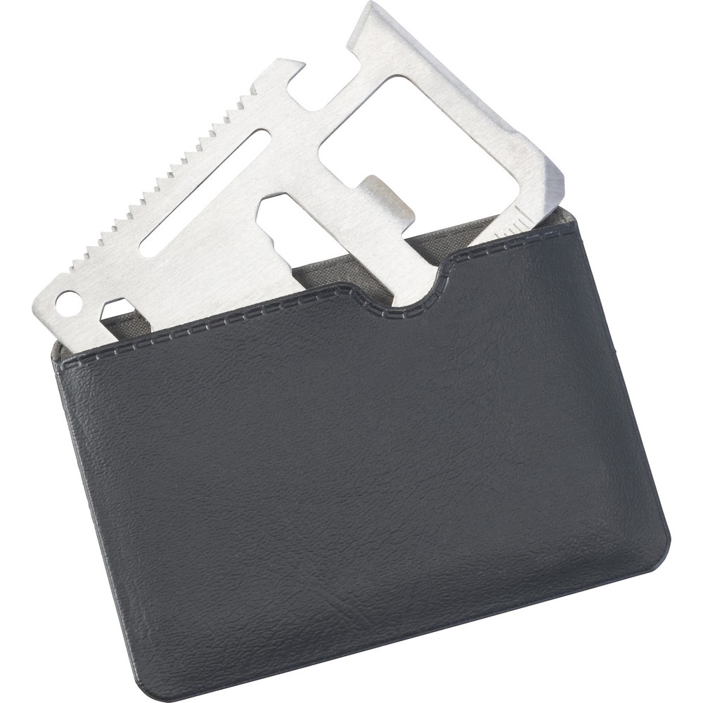 Narzędzie wielofunkcyjne, 11 funkcji: nóż, otwieracz do puszek, klucz motylkowy, piła, śrubokręt, otwieracz do butelek, linijka i klucze w różnych rozmiarach, w pokrowcu