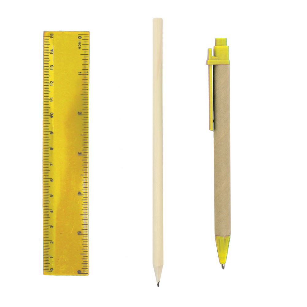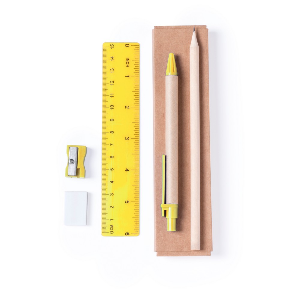 Zestaw szkolny w pudełku, ołówek, długopis z trzonem z kartonu z recyklingu, gumka, temperówka i linijka